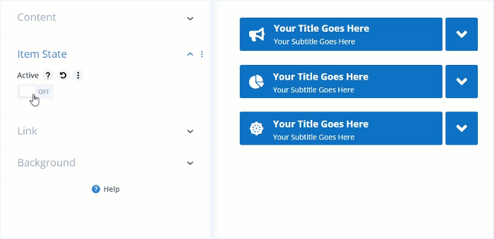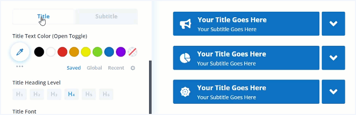 Set heading levels for the accordion item title and subtitle (H1 – H6). All other font options available as well.
