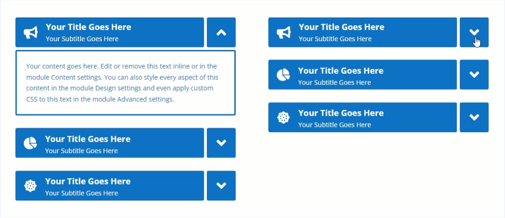The Global Accordion Mode feature allows having only one expanded accordion item across multiple accordion modules on the page that have this feature enabled. Good for creating multi-column accordions (for example, FAQs section, etc.).