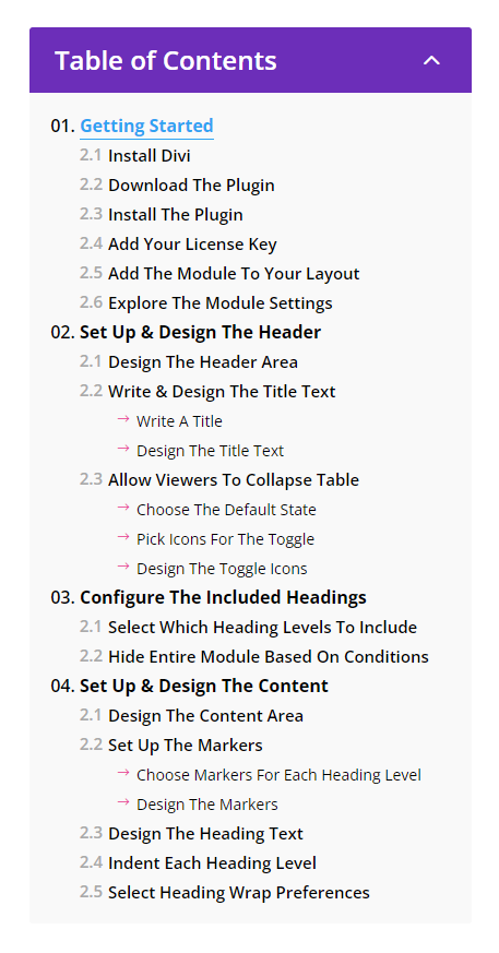 Designed specifically for the Divi ecosystem, this module gives you complete visual control. Choose from multiple numbering styles, collapsible layouts, sticky positioning, smooth scrolling, icons, animations, and advanced styling options — all without writing a single line of code. Every element can be customized in the familiar Divi Visual Builder, ensuring perfect alignment with your site’s branding and layout.