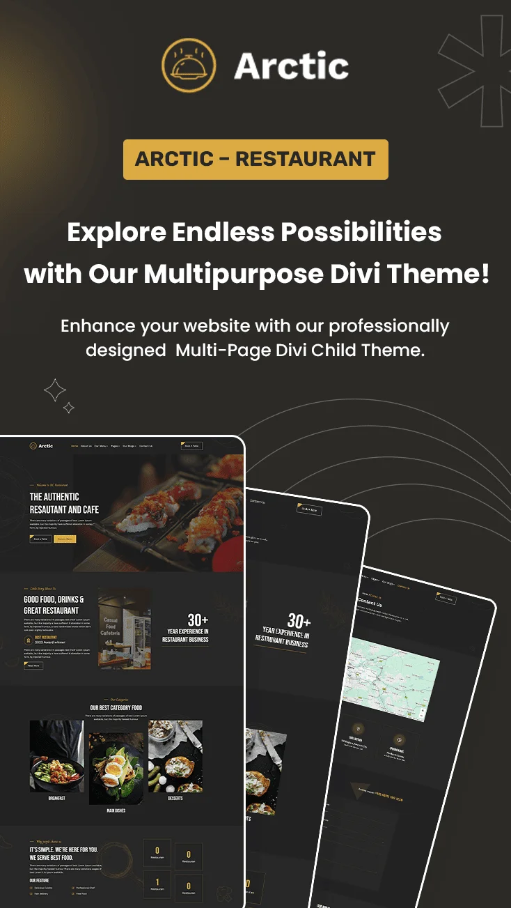 Arctic is a sleek and contemporary Divi Child Theme crafted specifically for restaurants, cafés, and food-related businesses. Its versatile, multi-page layout makes it easy to build a visually impressive website that fits your brand. Built entirely with Divi modules, the theme offers effortless customization—no coding required. It comes with a predesigned global header and footer, ensuring a cohesive and professional look across your site. With its clean design, mobile-friendly structure, and intuitive features, Divi Restaurant makes it simple to showcase your menu, highlight your services, and display customer testimonials with ease.