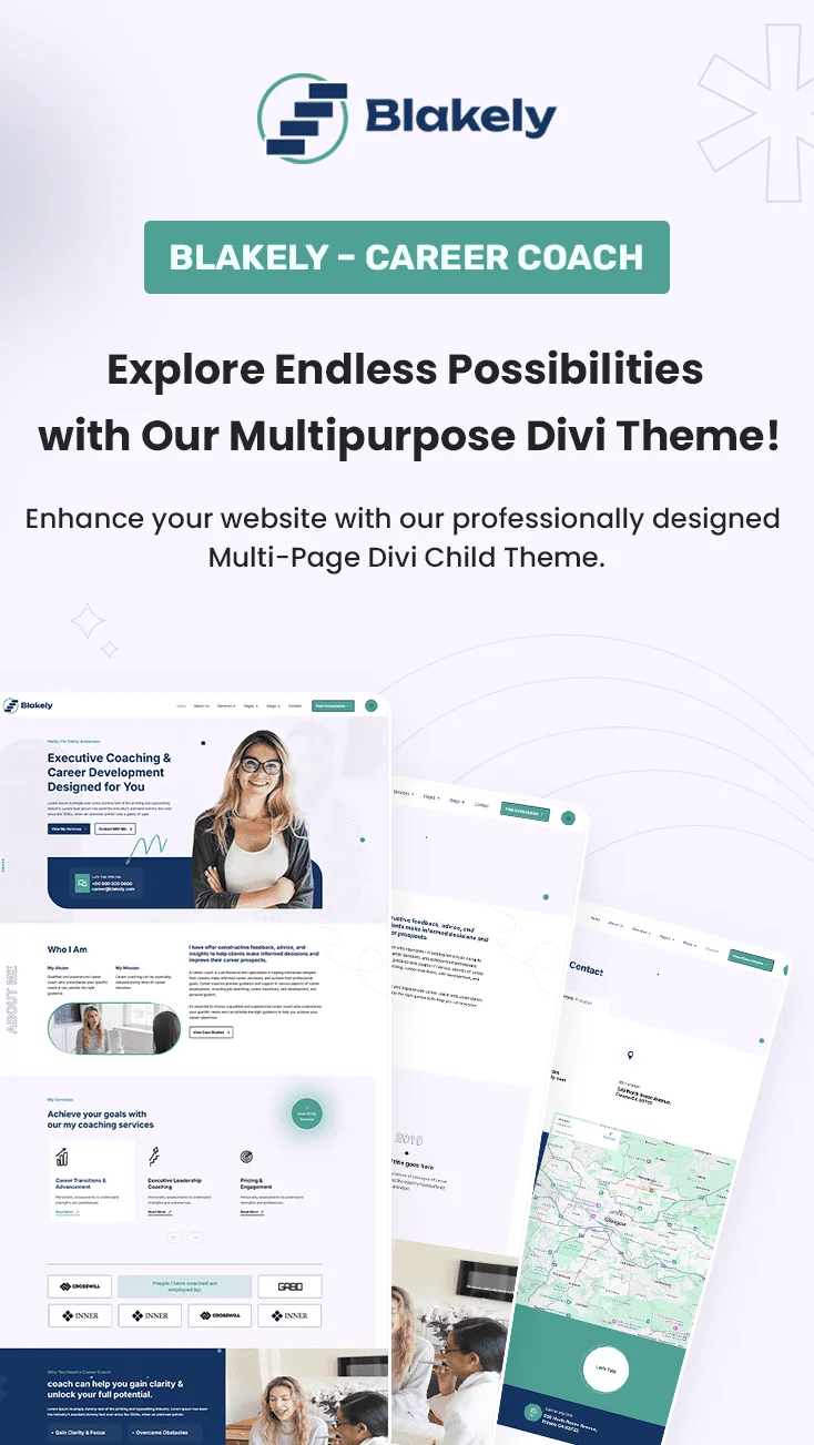 Blakely Career Coach is a bold and versatile Divi Child Theme designed for career coaches, job consultants, and professional mentors. With a flexible multi-page layout, it includes everything you need to build a sleek, user-friendly website. Built entirely with Divi modules, it allows easy customization without any coding. The prebuilt global header and footer provide a consistent, professional look across every page. Whether you’re offering one-on-one coaching, career advice, or resume services, Blakely helps you make a strong impression and attract the right clients.