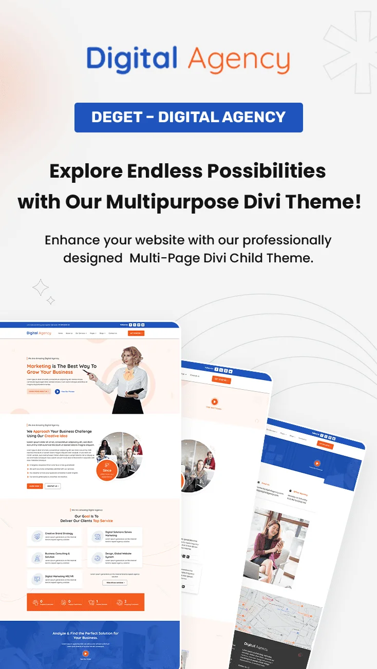 Divi Digital Agency is a clean and contemporary Divi Child Theme crafted for digital agencies, marketing firms, creative studios, and freelancers. With its flexible multi-page layout, it provides everything you need to create a standout website with ease. Fully built using Divi modules, customization is simple and code-free. The theme includes a predesigned global header and footer, making site-wide updates fast and consistent. Designed for speed, responsiveness, and usability, Divi Digital Agency helps you build a strong and professional online presence that sets your brand apart.