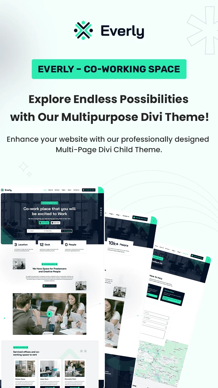 Everly Co-Working Space is a flexible and modern Divi Child Theme designed for co-working hubs, shared offices, and dynamic workspaces. Featuring a multi-page, multi-purpose layout, it’s ideal for showcasing co-working memberships, private offices, and meeting room bookings. Built entirely with Divi modules, Everly is easy to customize—no coding required—so you can tailor it to match your brand and space. A predesigned global header and footer ensure a seamless, professional look across your site. Whether you manage a boutique shared office or a large-scale co-working hub, Everly helps you present your offerings with clarity, style, and professionalism.