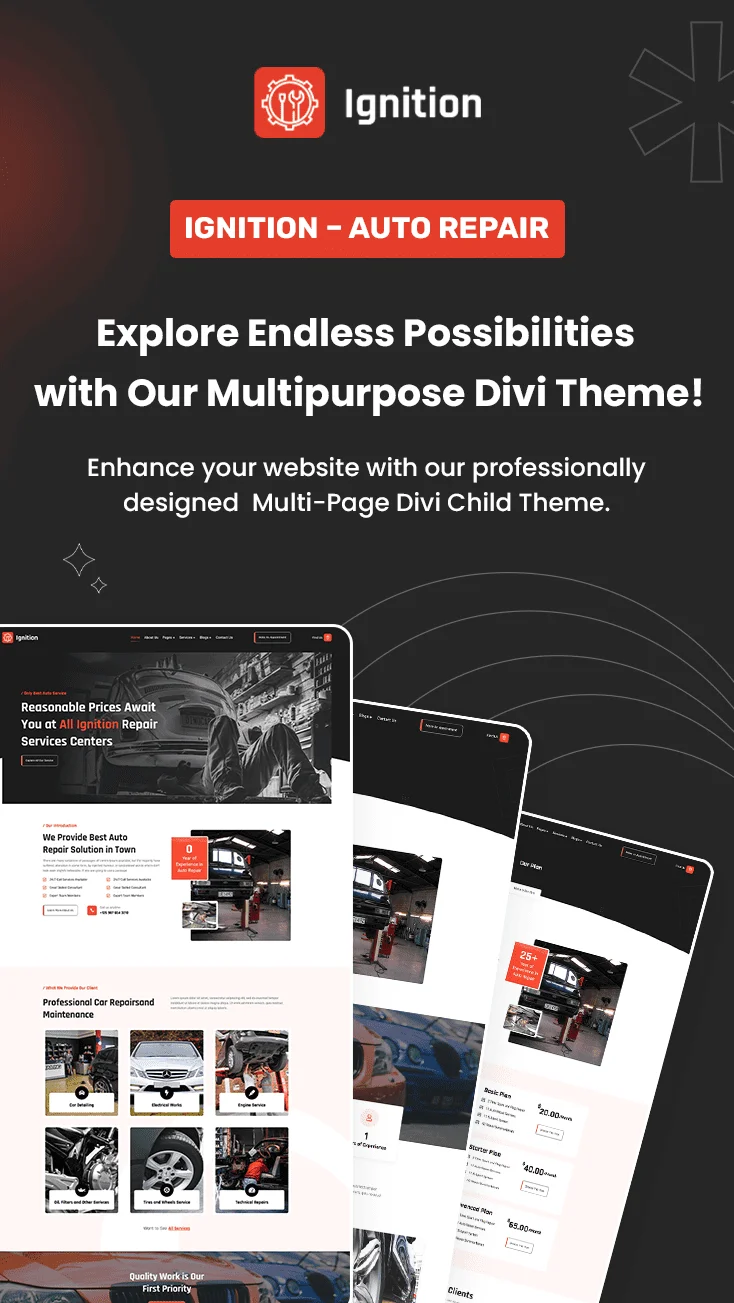 Divi Auto Repair is a modern and professional Divi Child Theme built for car repair shops, auto service centers, and mechanics. Featuring a versatile multi-page layout, it provides all the essentials to create a fully functional and engaging website for your business. Built entirely with Divi modules, customization is quick and code-free. A predesigned global header and footer ensure a consistent, polished appearance across your site. With its clean design, responsive layout, and intuitive features, Divi Auto Repair makes it easy to highlight your services, display pricing, and share customer reviews with confidence.