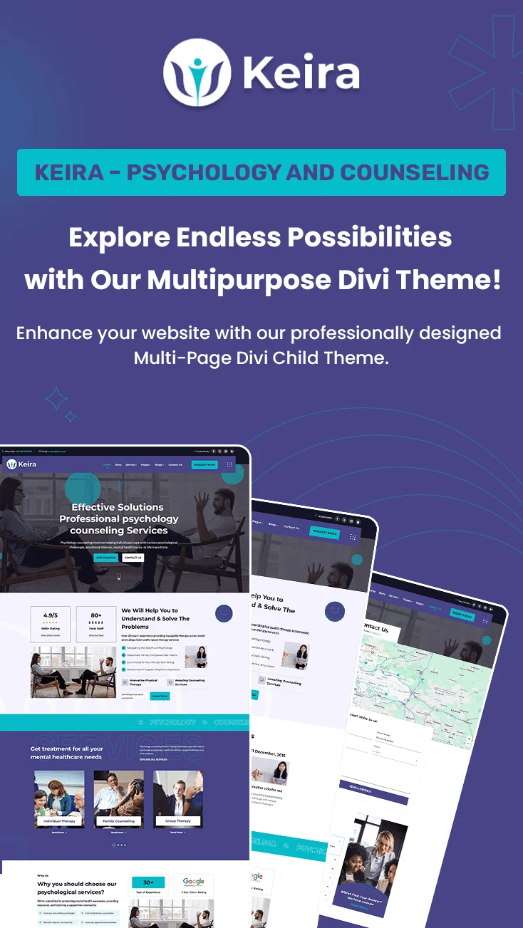 Keira is a serene and modern Divi Child Theme thoughtfully designed for psychologists, therapists, and counseling professionals. Its clean, multi-page layout is built entirely with Divi modules, allowing for effortless customization without coding. A predesigned global header and footer provide a cohesive and professional look across your site. With dedicated sections for services, therapist profiles, testimonials, blog posts, and contact information, Keira helps you connect with clients and build credibility. Perfect for mental health practitioners, this theme creates a warm, welcoming online presence that inspires trust and encourages engagement.